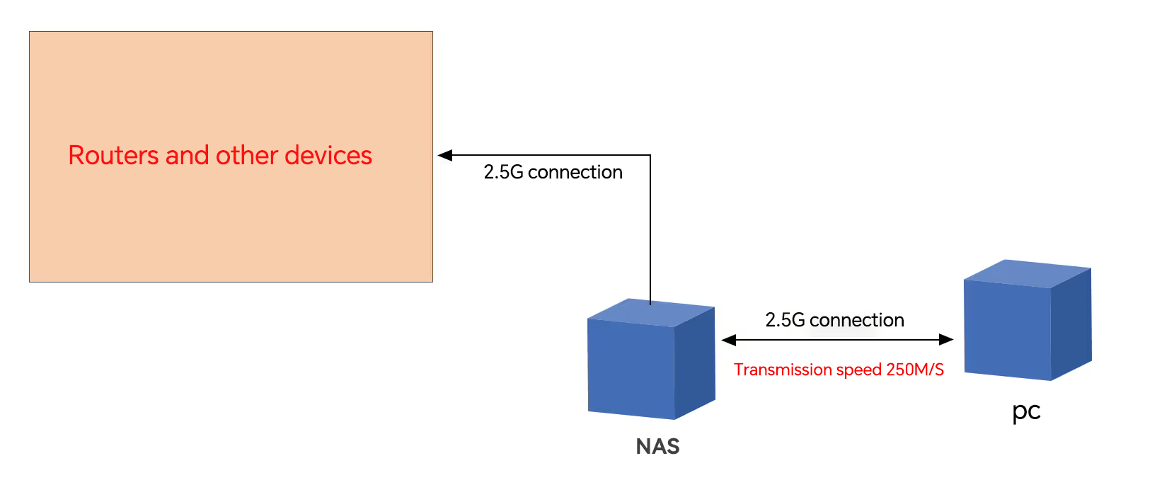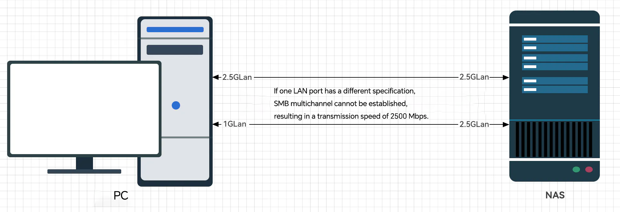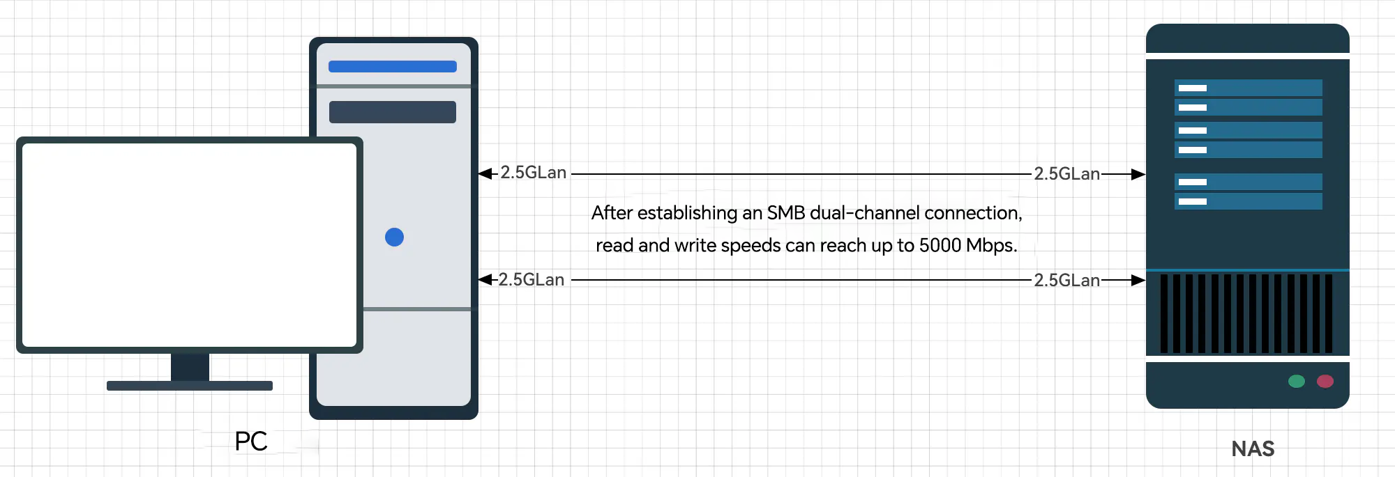 For example, in the scenario depicted above, if both the computer and NAS are equipped with dual 2.5G network cards and support SMB multichannel, data transmission via the SMB protocol can achieve speeds of up to 5000 Mbps. Similarly, if both devices have dual Gigabit network cards, speeds can reach 2000 Mbps under SMB.