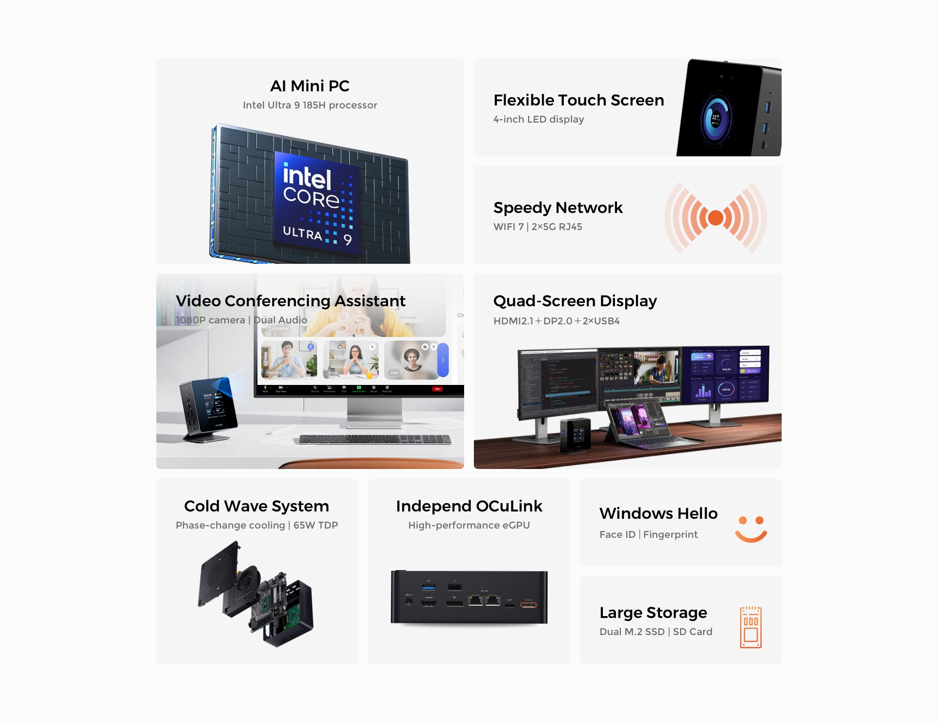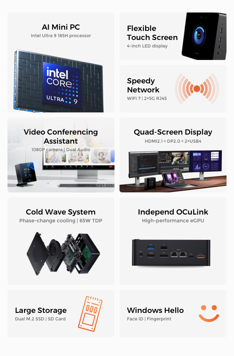 Supporting up to 64Gbps of transmission bandwidth, it is easy to expand the higher performance of external desktop graphics cards, turning the Mini PC into a workstation in seconds to meet the arithmetic needs of high-end gaming, professional creation and AI work.