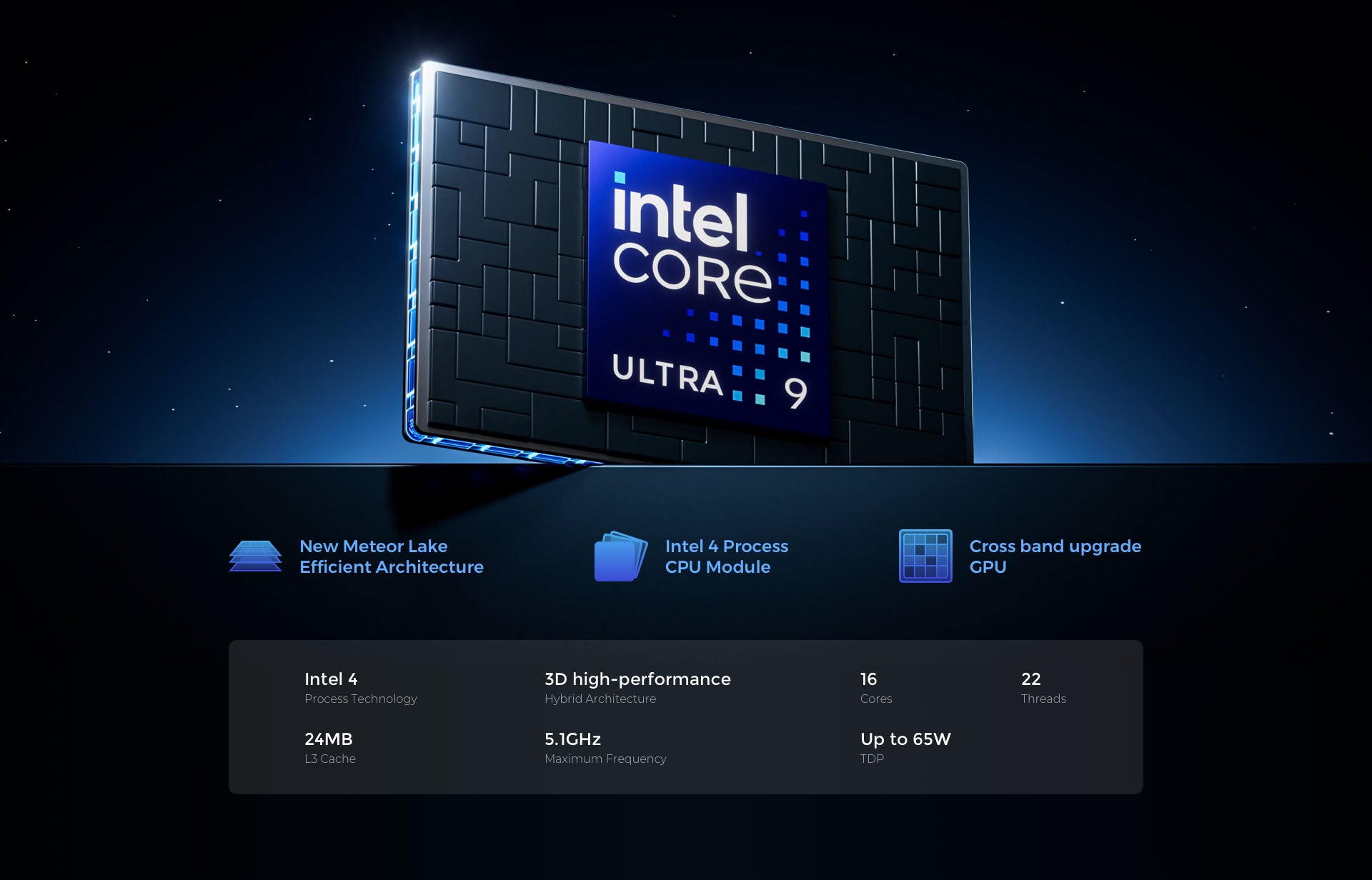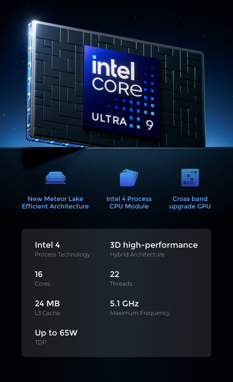 The New Intel Core Ultra9 Flagship Processor, built on Intel 4nm Process Technology, featuring a 3D High-Performance Hybrid Architecture, with 16 Cores and 22 Threads, 24MB L3 Cache, reaching a maximum frequency of 5.1GHz, with a power consumption as low as 65W, providing breakthroughs in both performance and efficiency for a smoother and more efficient computing experience.