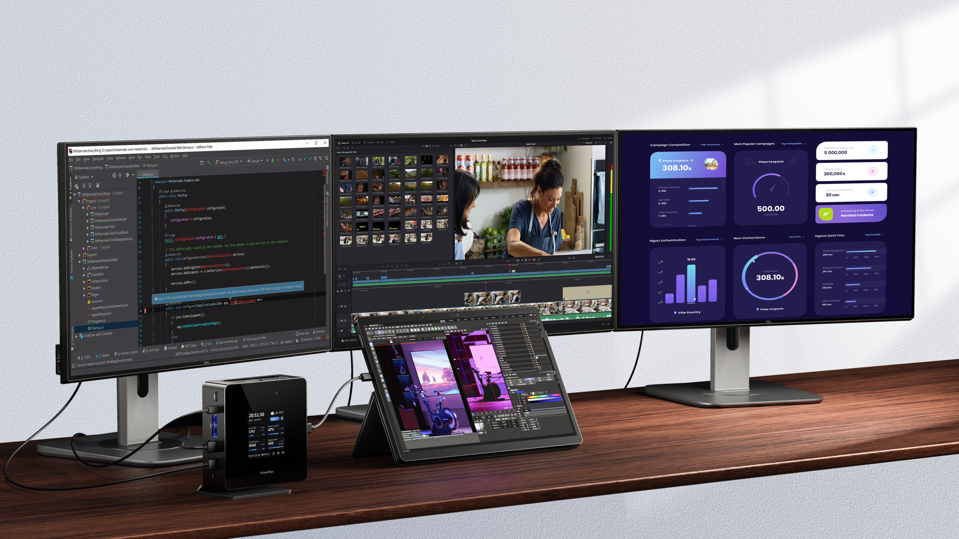 Dual USB4 ports, an HDMI2.1 interface and a DP2.0 interface, can be simultaneously connected to four 4K screen, to realize the four-screen display, to open a new vision of the efficient office.