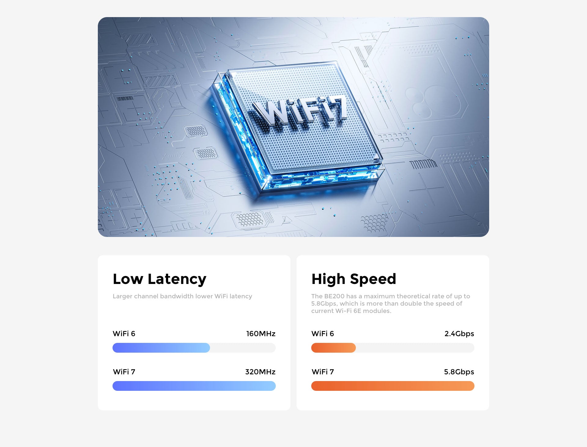 Equipped with Intel's next-generation WiFi-7 wireless card with up to 5.8Gbps theoretical peak rate and 320MHz channel bandwidth.
