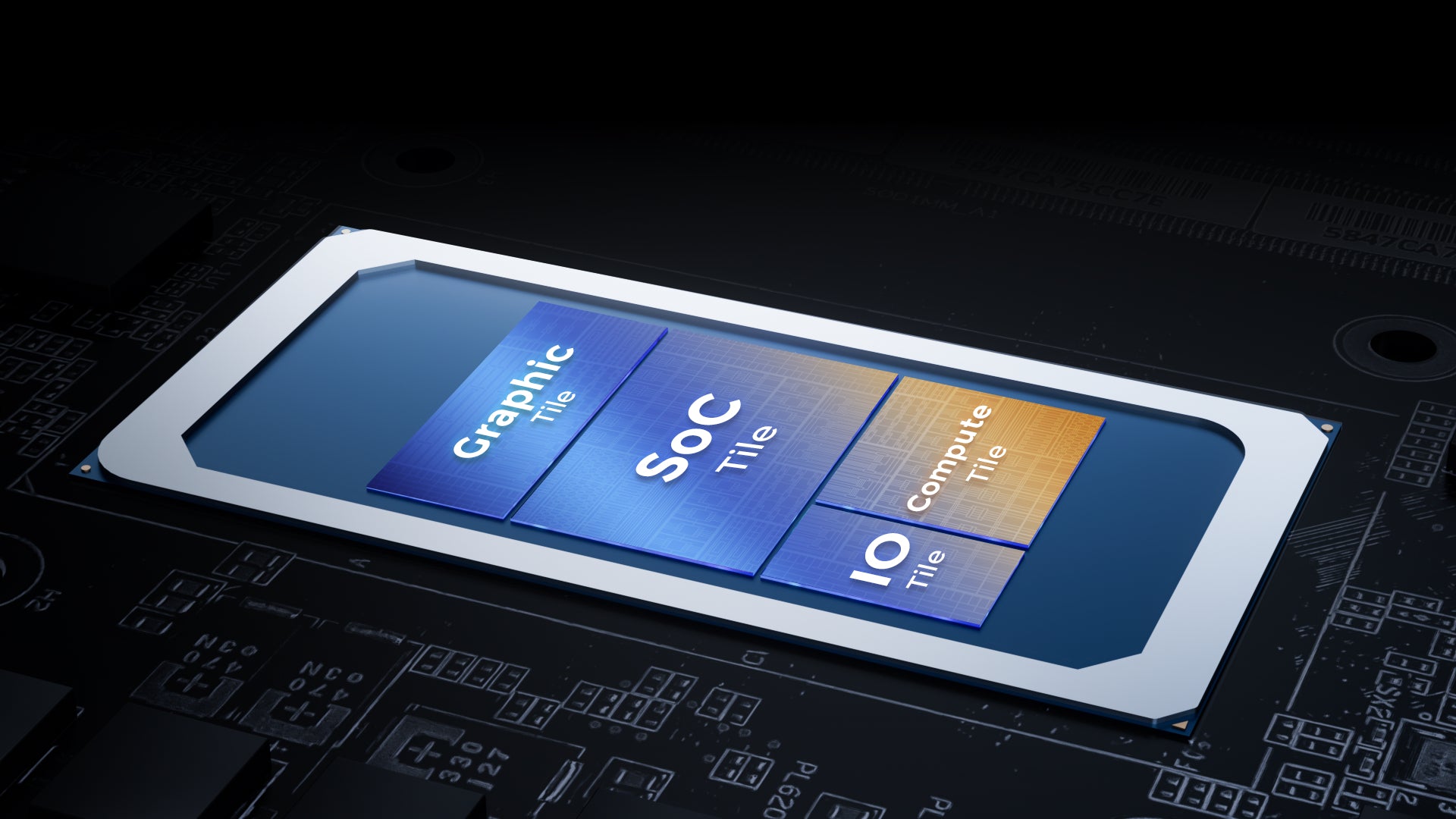 The chip design consists of a Computer Tile, a SOC Tile, an I/O Tile and a GPU Tile, reflecting a revolutionary and innovative approach to modular chip architecture.