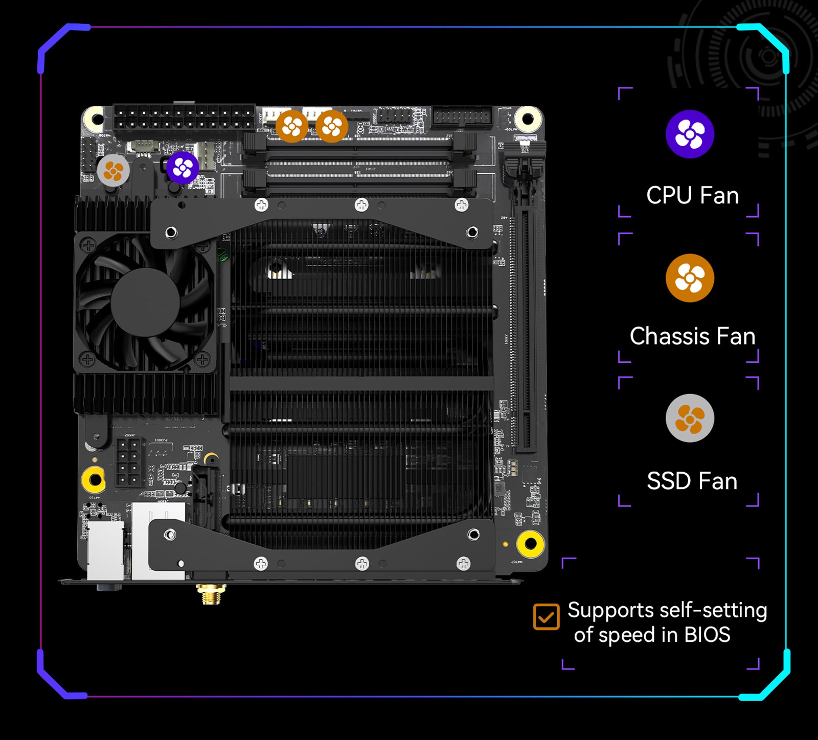 The meticulously designed CPU cooling module, combined with a large heat sink that covers 80% of the motherboard's surface area, ensures that the motherboard remains cool and stable under heavy loads, maintaining optimal performance.
