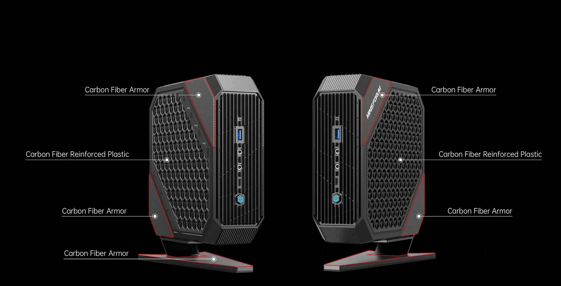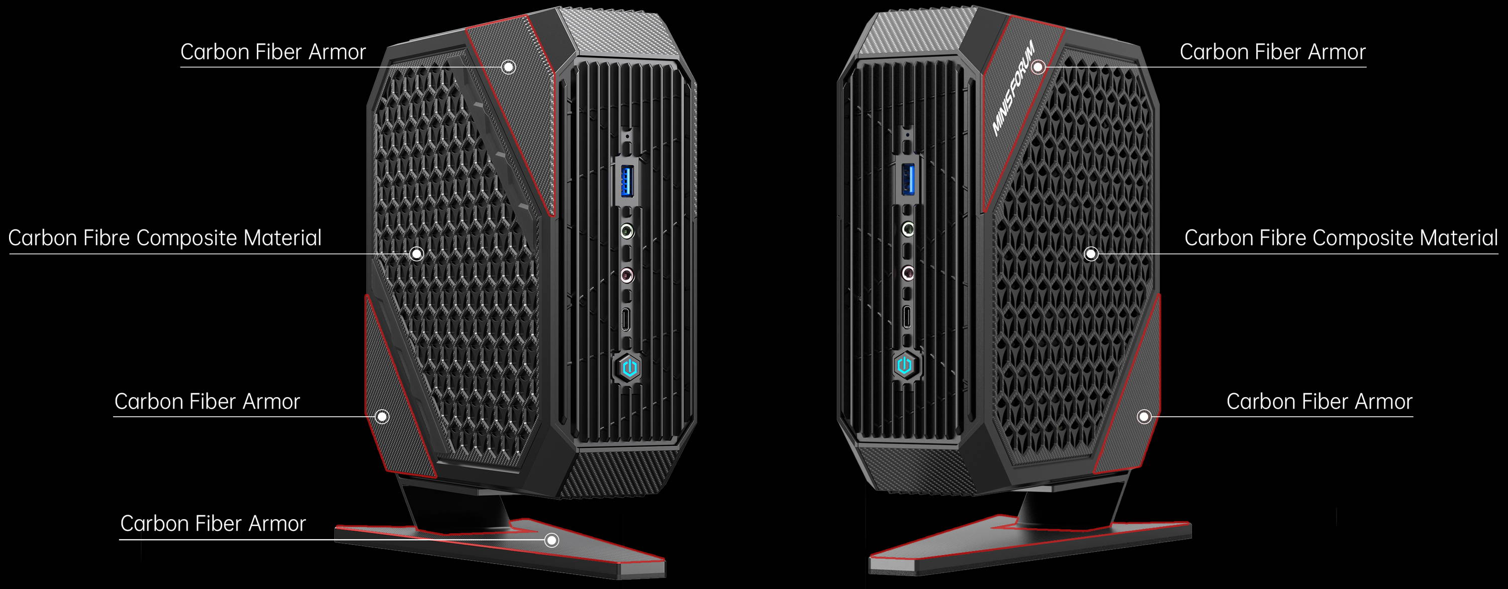 The diagonal corners and the base of the case are covered in carbon-fiber armor, in which the armor consists of 70% carbon fiber material and 30% resin. Carbon-fiber composites are used in the case's grille and side corners to improve strength and thermal conductivity. Such on optimized design also keeps the case smooth and classy with its excellent abrasion and corrosion resistance. You can place the HX77G vertically by using the included base to save space ond improve heot dissination.
