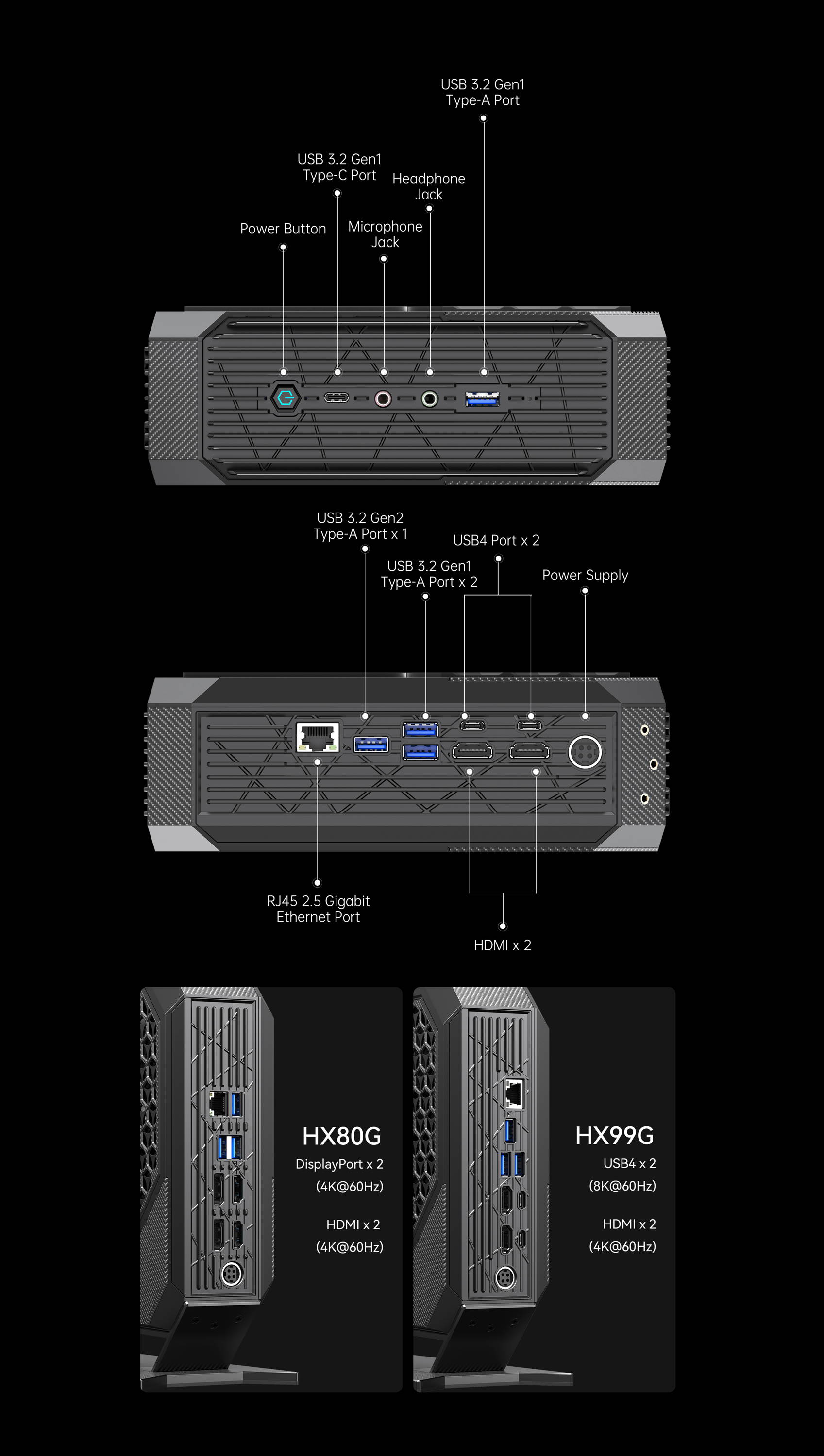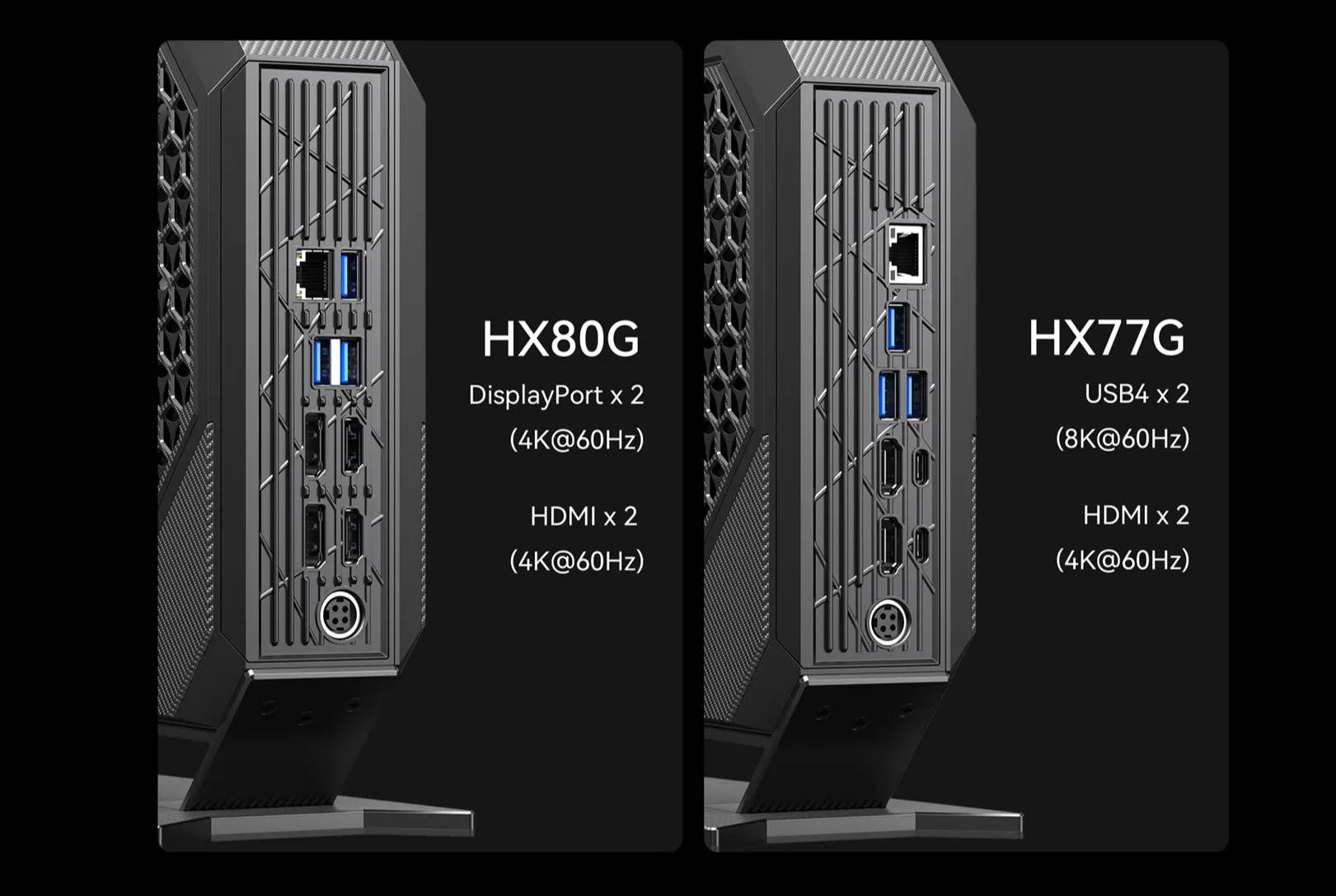 Two USB4 Type-C ports on HX99G allow users to set up two monitors simultaneously with a maximum resolution of 8K@60Hz. HX99G is also equipped with 2 HDMI ports. These four ports can support a maximum of four 4k@60Hz independent displays. HX99G can deliver the best-in-class visual experience with true-to-life clarity and glorious details.