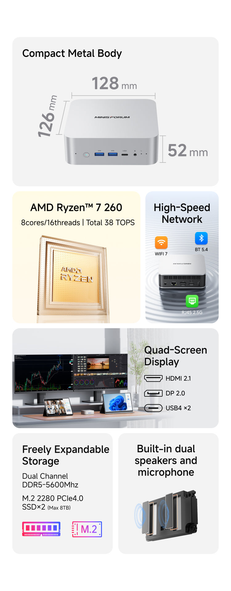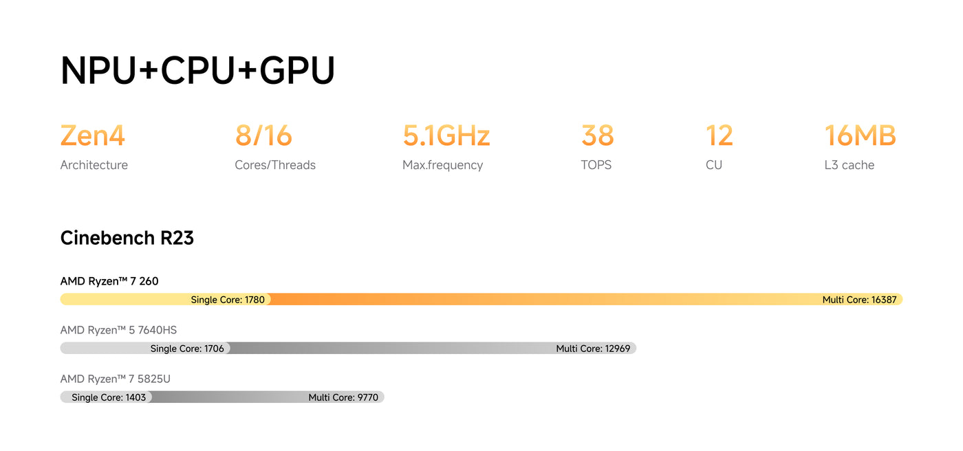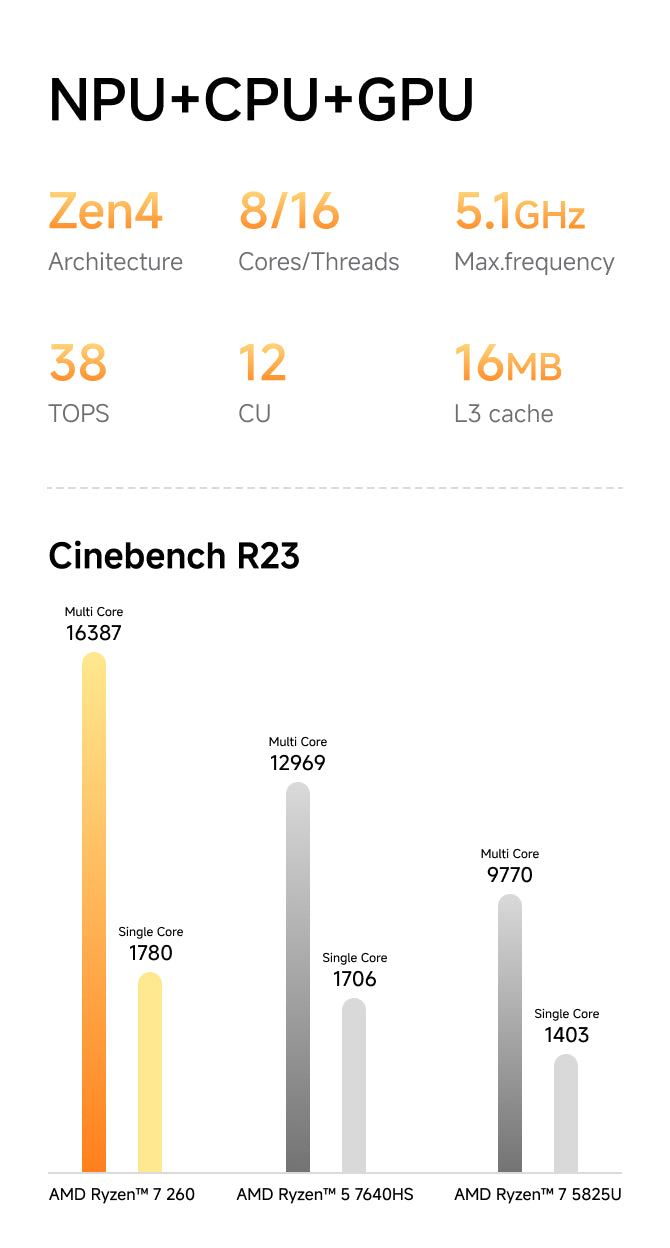 The AMD Ryzen 7 260 processor with up to 65W TDP gives you an even greater edge in multitasking scenarios, allowing you to run multiple large programmes smoothly at the same time.