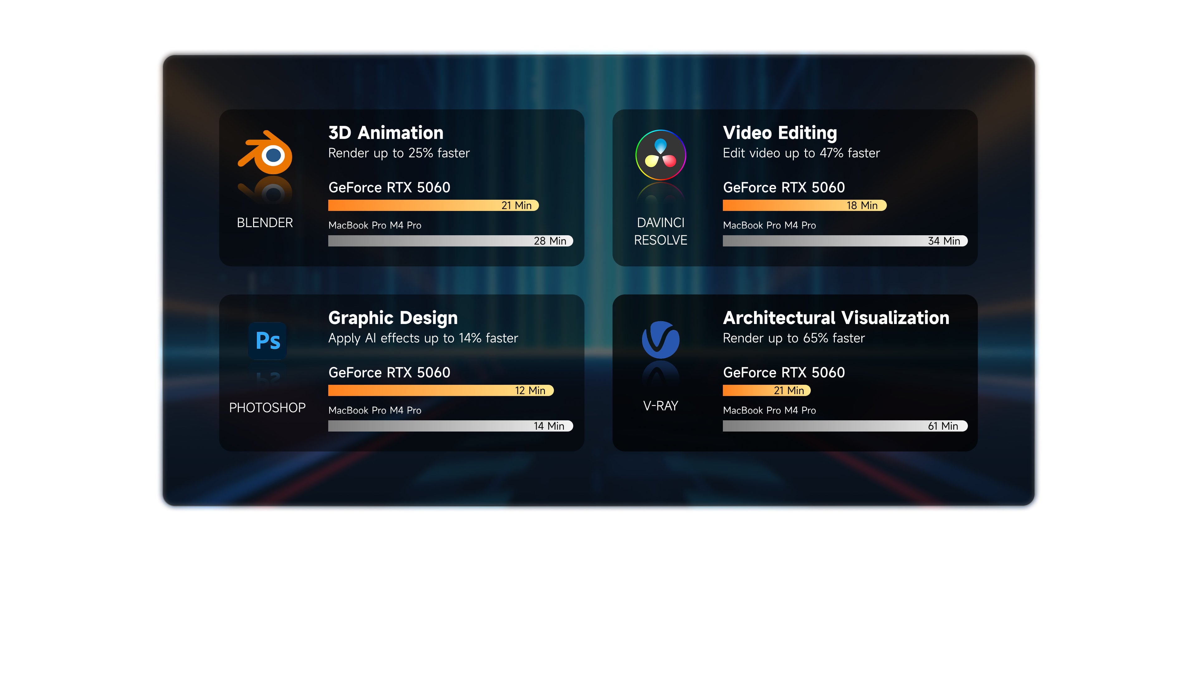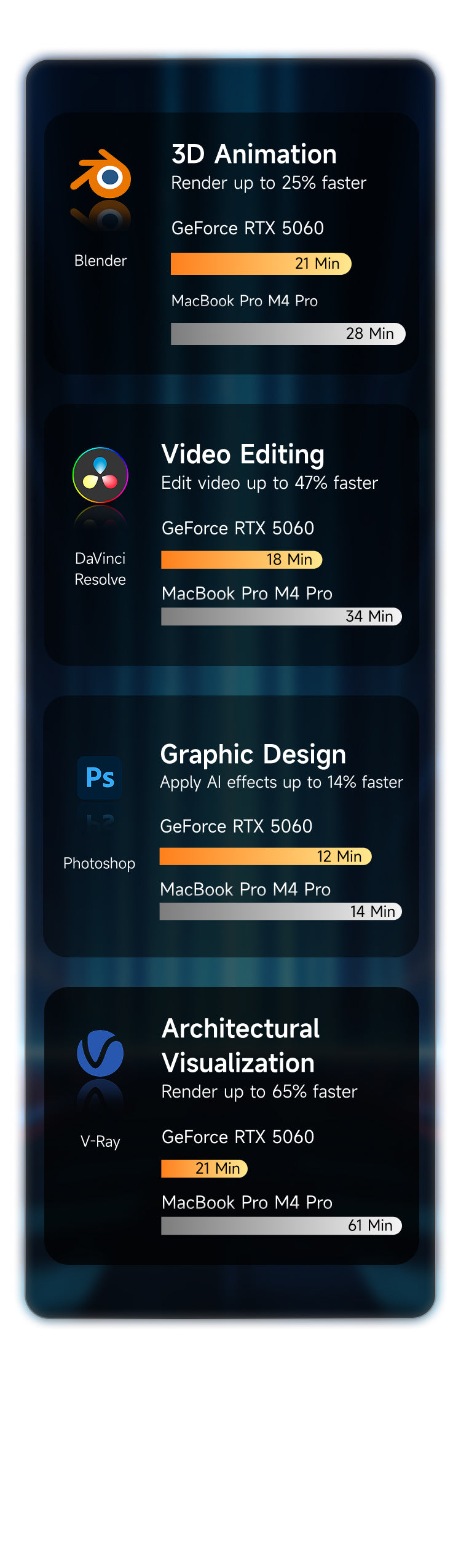The RTX 5060 delivers outstanding performance for AI-assisted creation. With NVIDIA Studio, it accelerates a wide range of creative software.