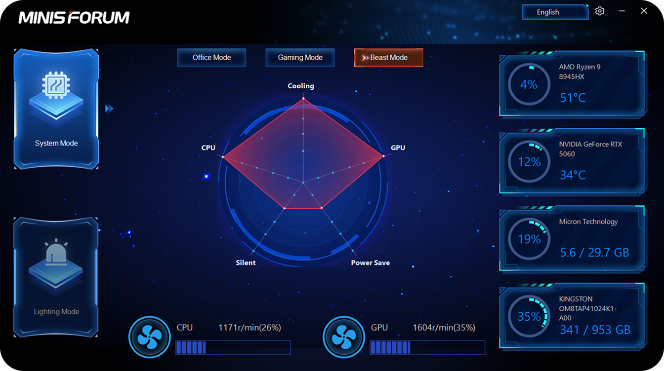 One-Click mode switching between Beast, Gaming, and Office mode for instant adaptation to any task.