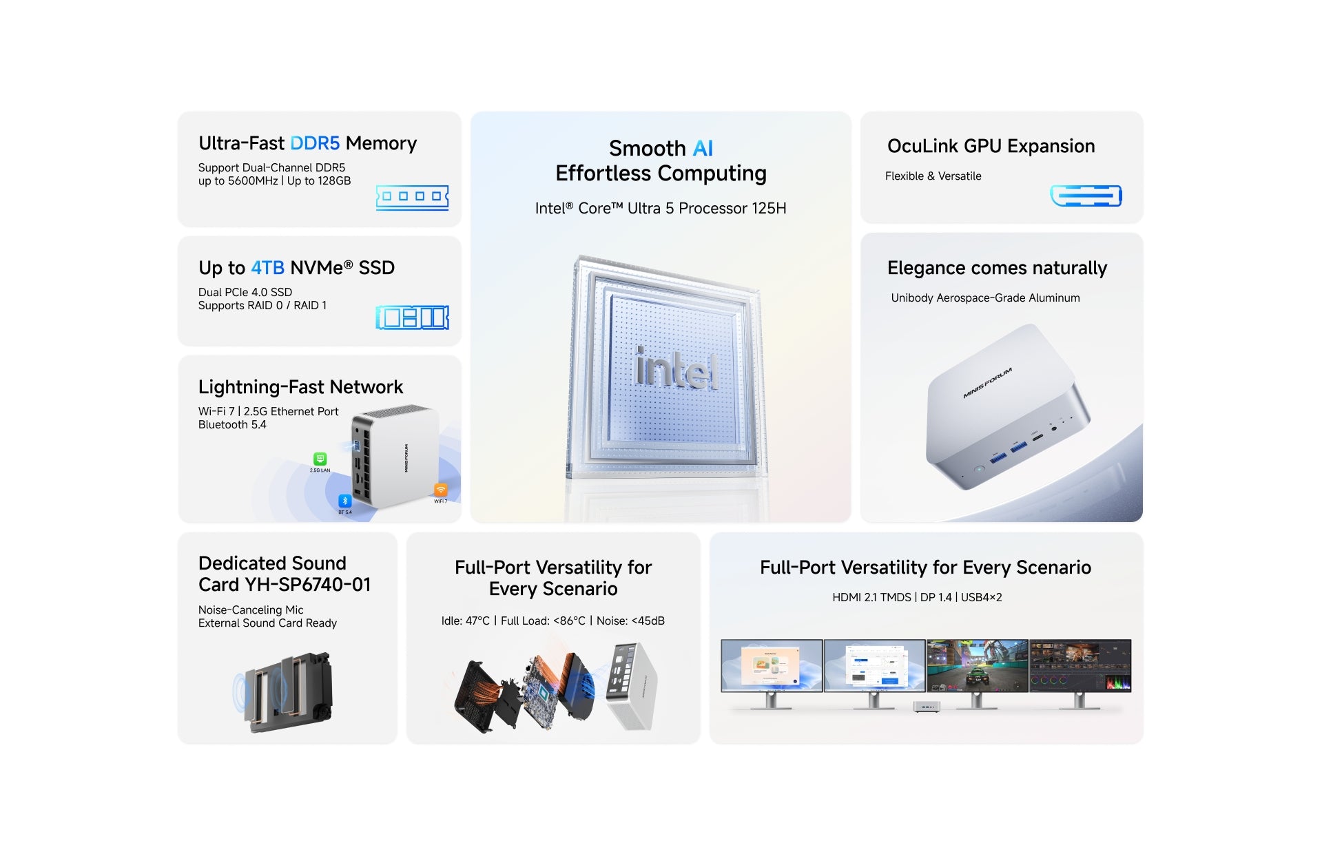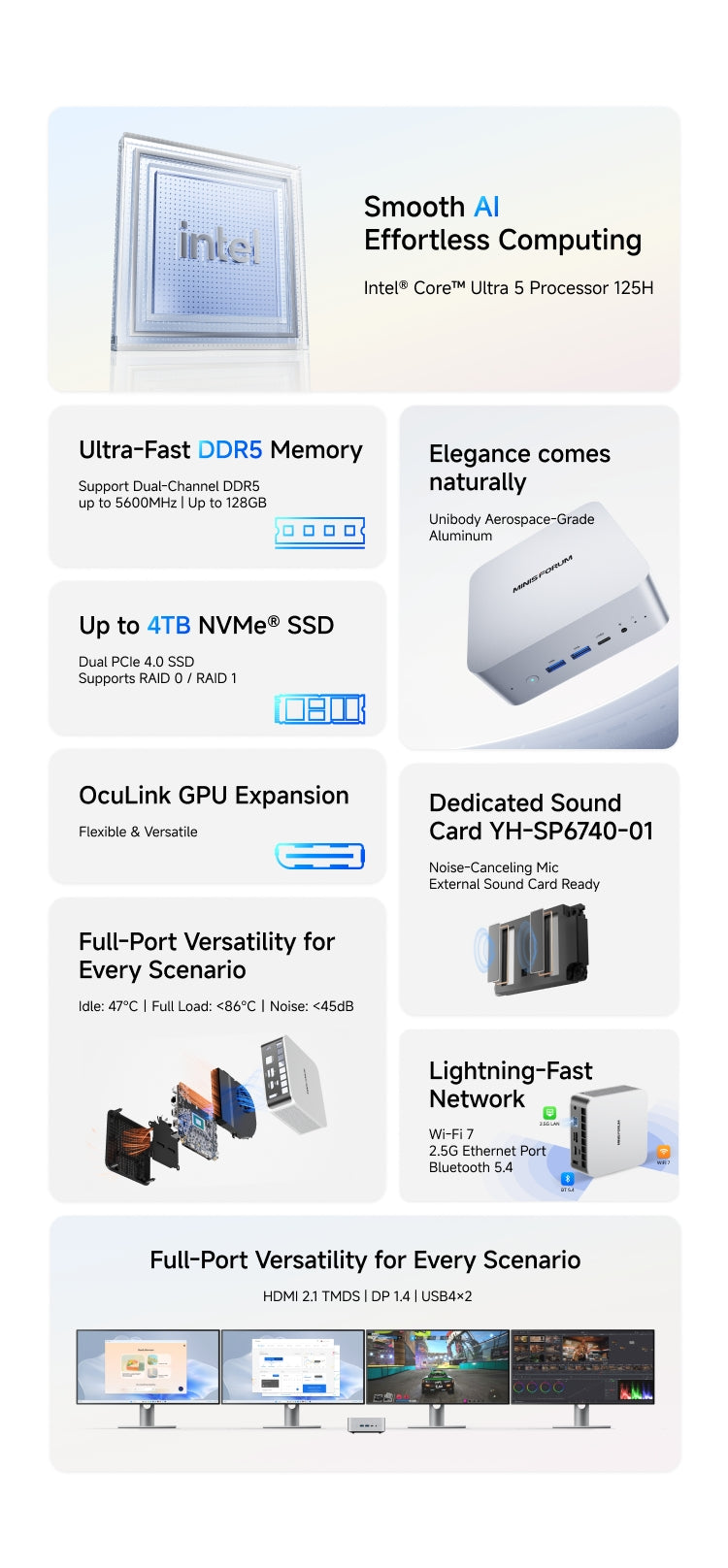 With an independent sound card and support for USB audio, it delivers exceptional sound quality. Quad-display output and WiFi 7 + 2.5G Ethernet ensure smooth, high-quality streaming and control.