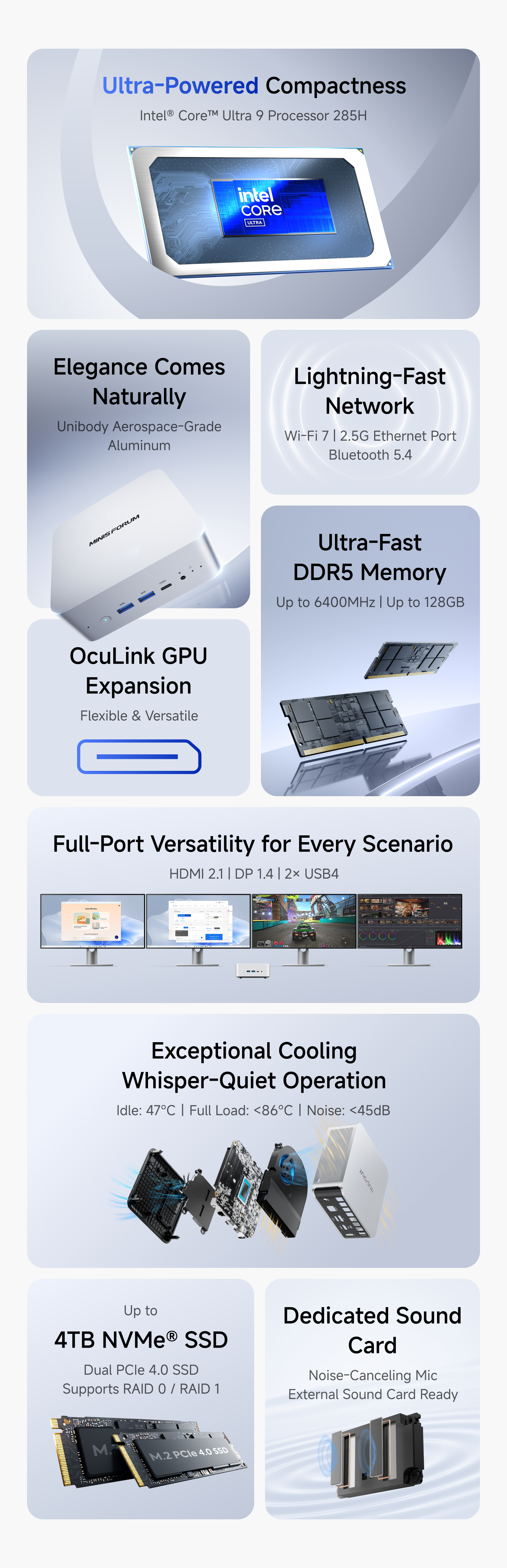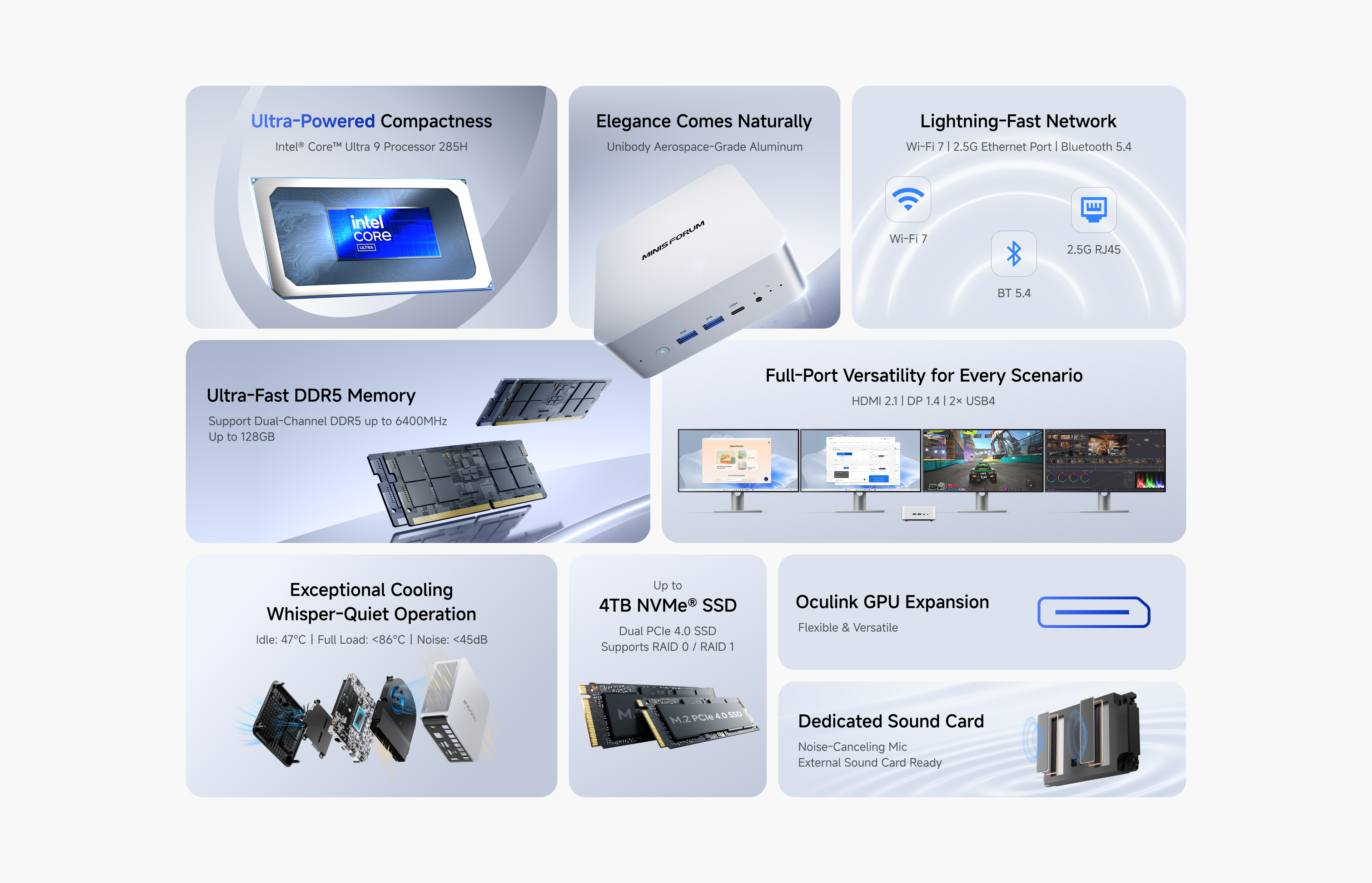 With an independent sound card and support for USB audio, it delivers exceptional sound quality. Quad-display output and WiFi 7 + 2.5G Ethernet ensure smooth, high-quality streaming and control.