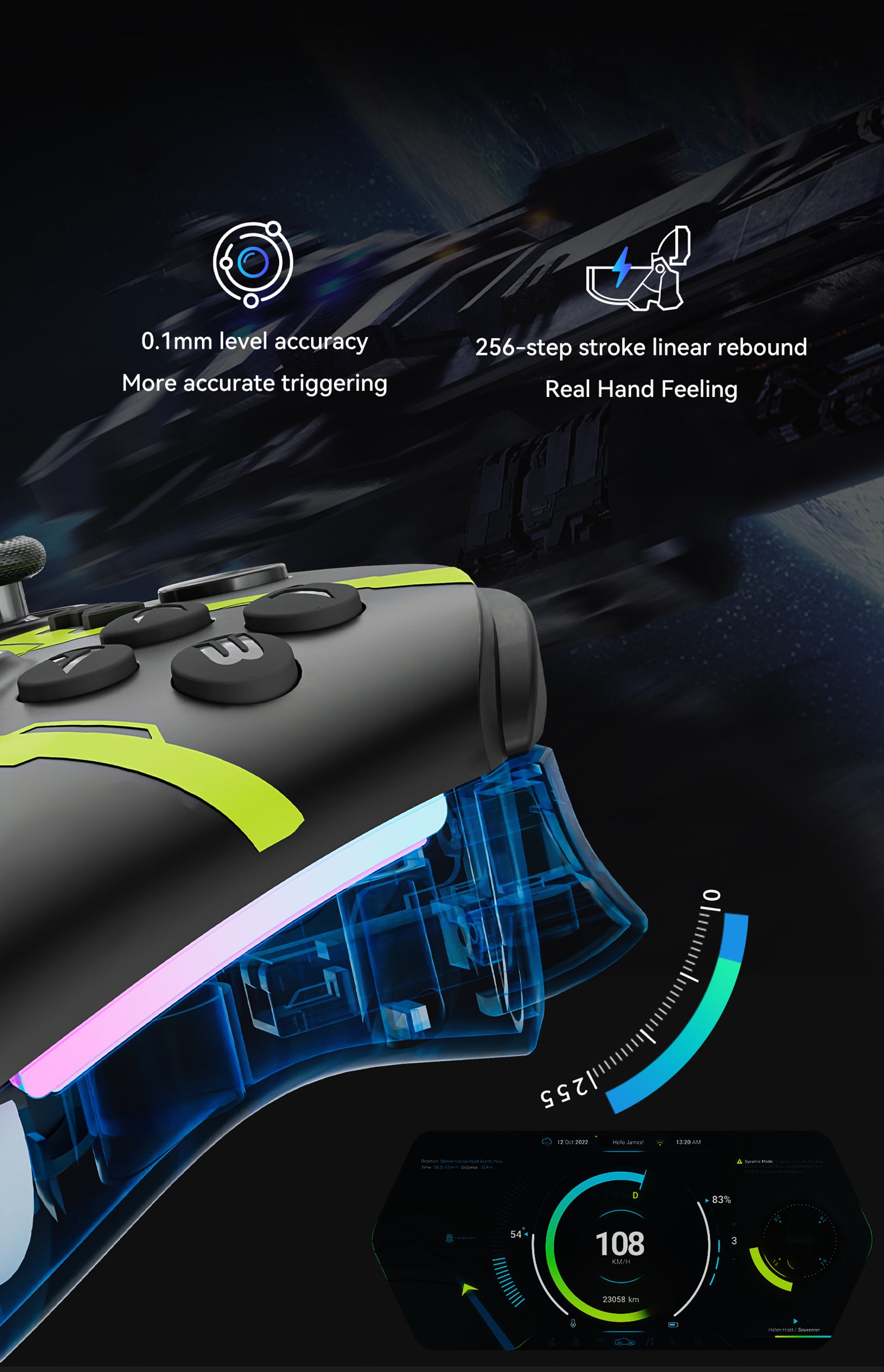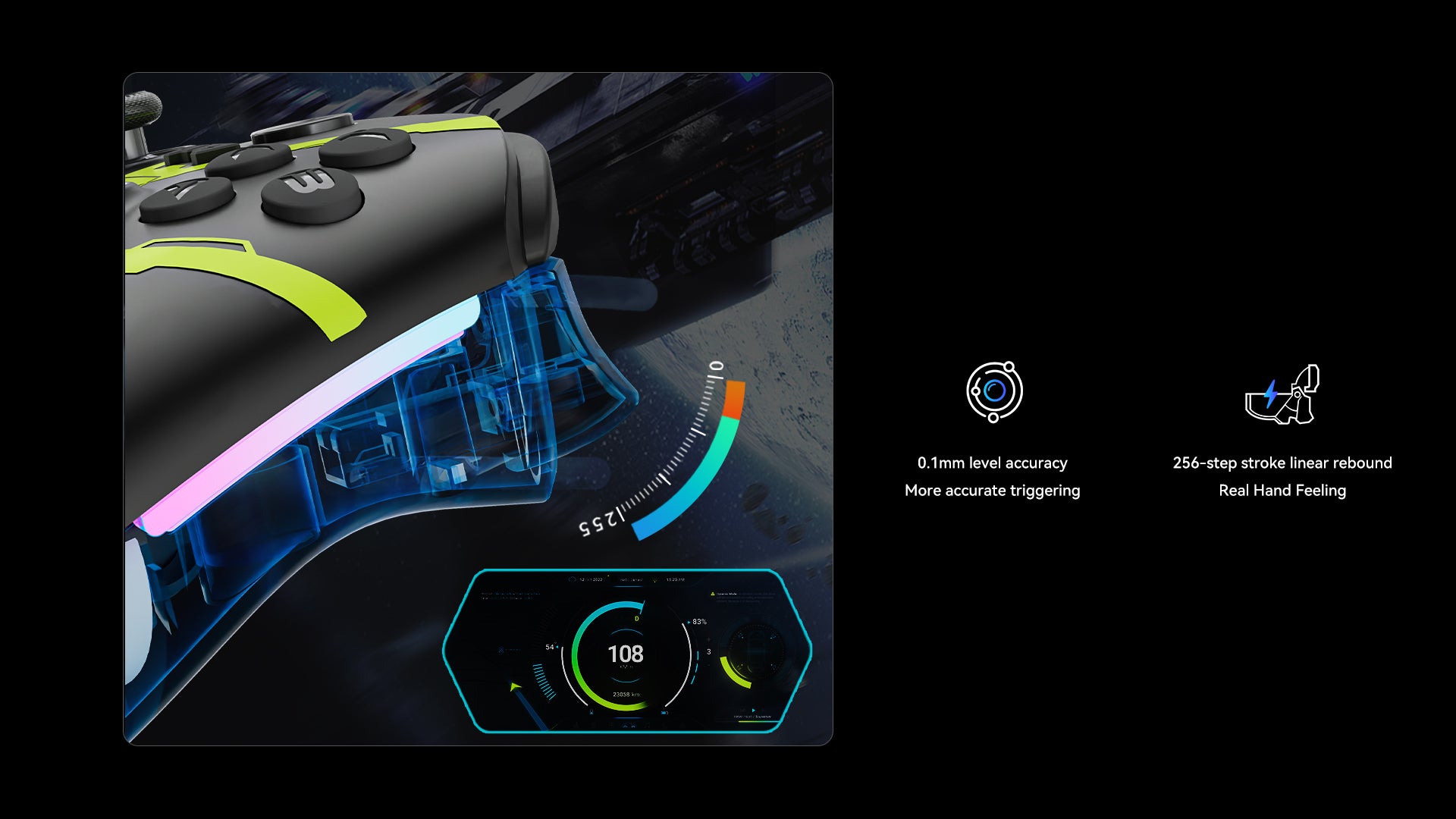 - Carbon film joystick & Hall linear trigger