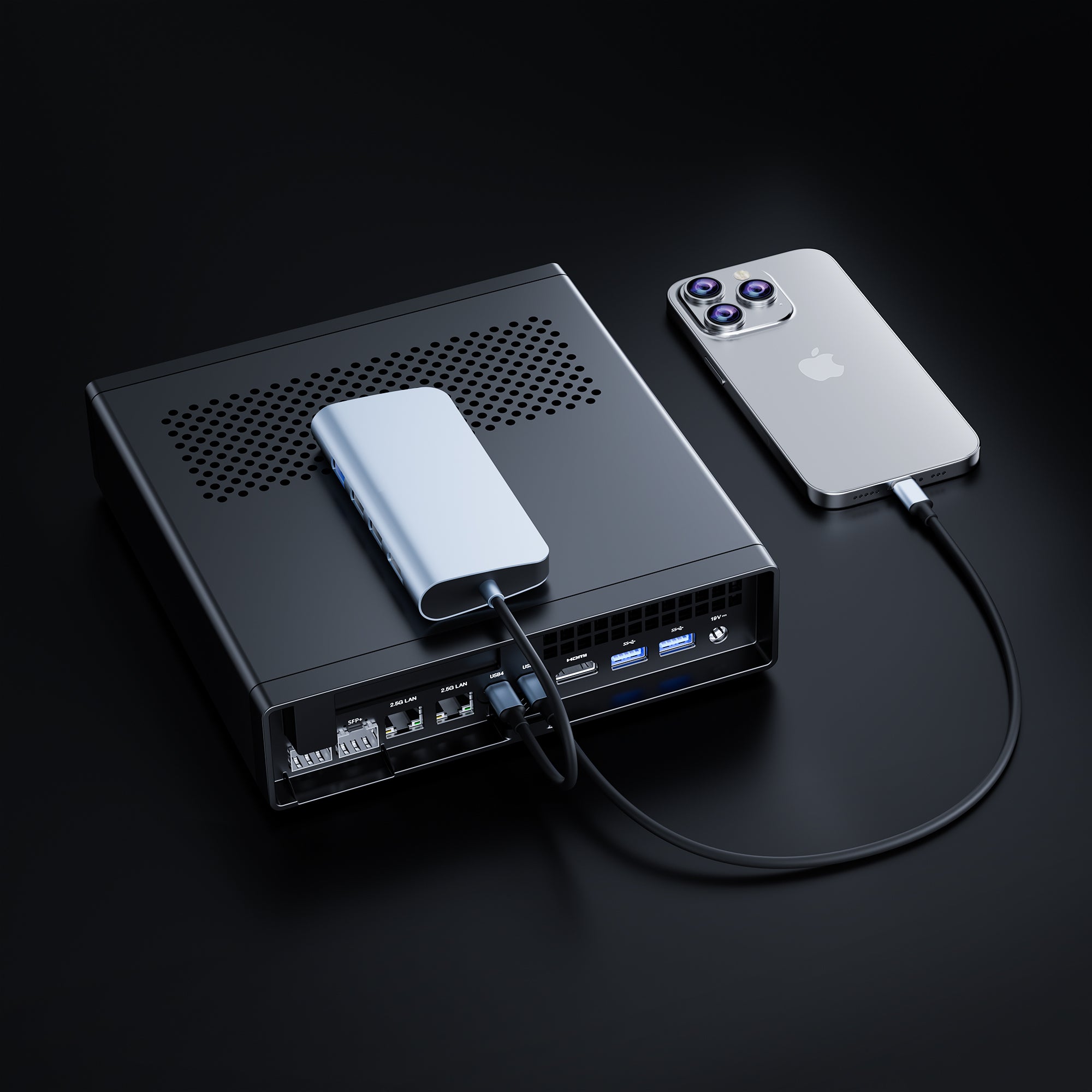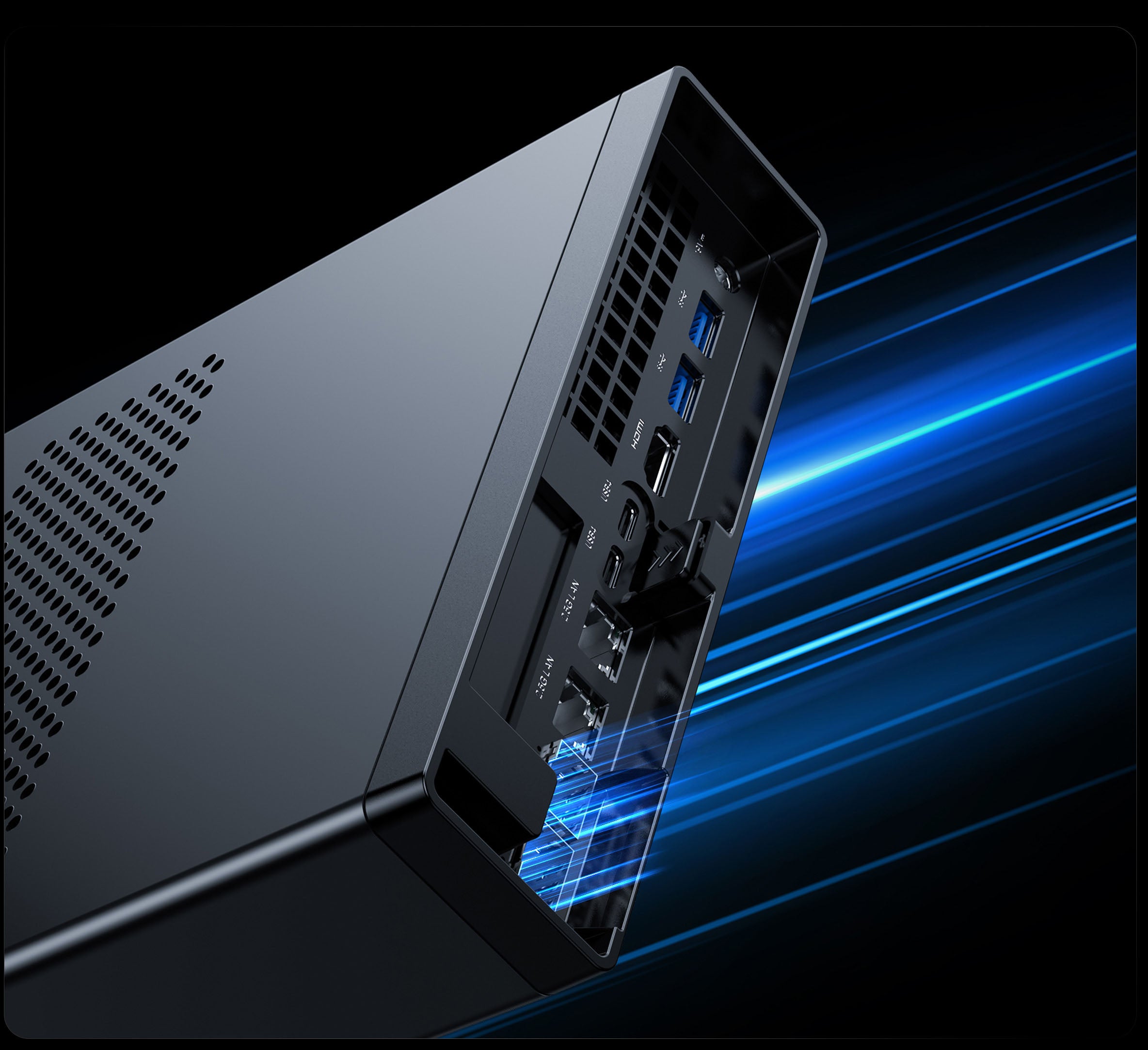 The MS-01 features two built-in 10 Gbps SFP+ LAN ports, two 2.5 Gbps RJ45 LAN ports, and two USB 4 ports, delivering a total Ethernet speed of up to 65 Gbps.This ensures an unparalleled high-speed network experience for you to enjoy.