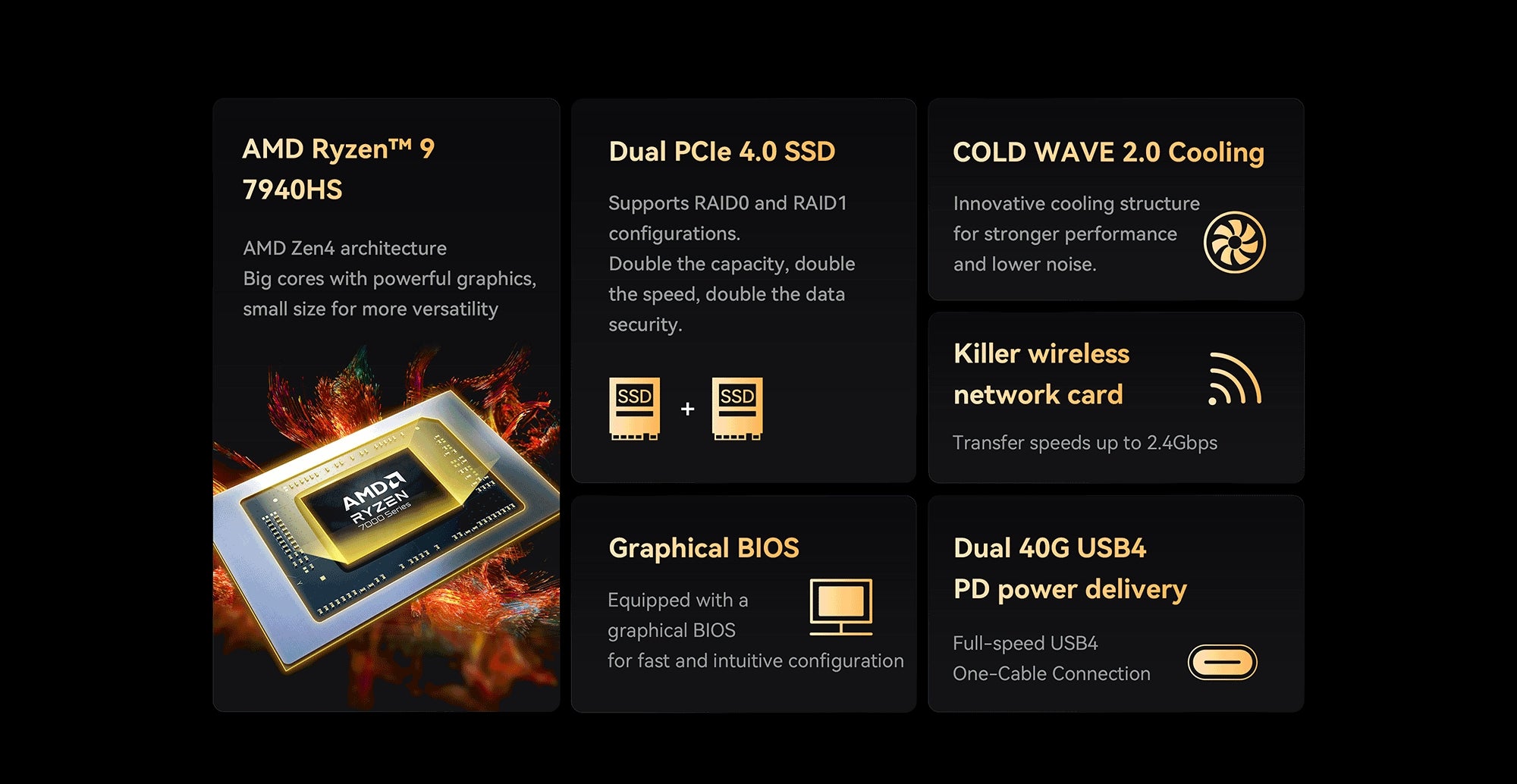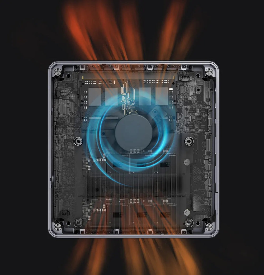 The UM790 Pro adopts an innovative thermal system with liquid metal and active cooling for memory and SSD. The Cold Wave 2.0 offers better thermal performance under lower noise level; therefore, the UM790 Pro is able to leverage its processor, memory and SSD, and deliver amazing performance.