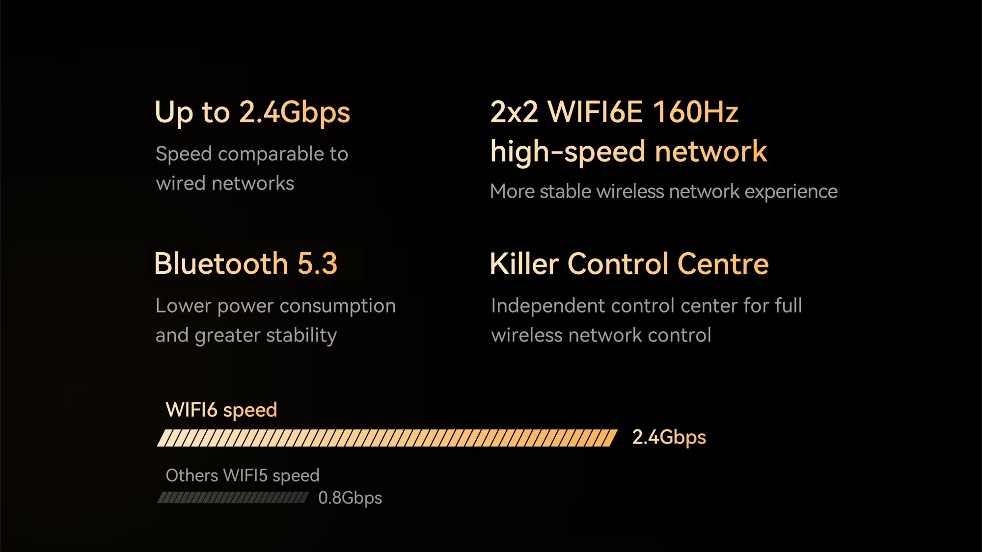 It supports Wi-Fi 6E 2*2 160MHz with a maximum speed up to 2.4Gbps, and prevents lactency and dropouts.