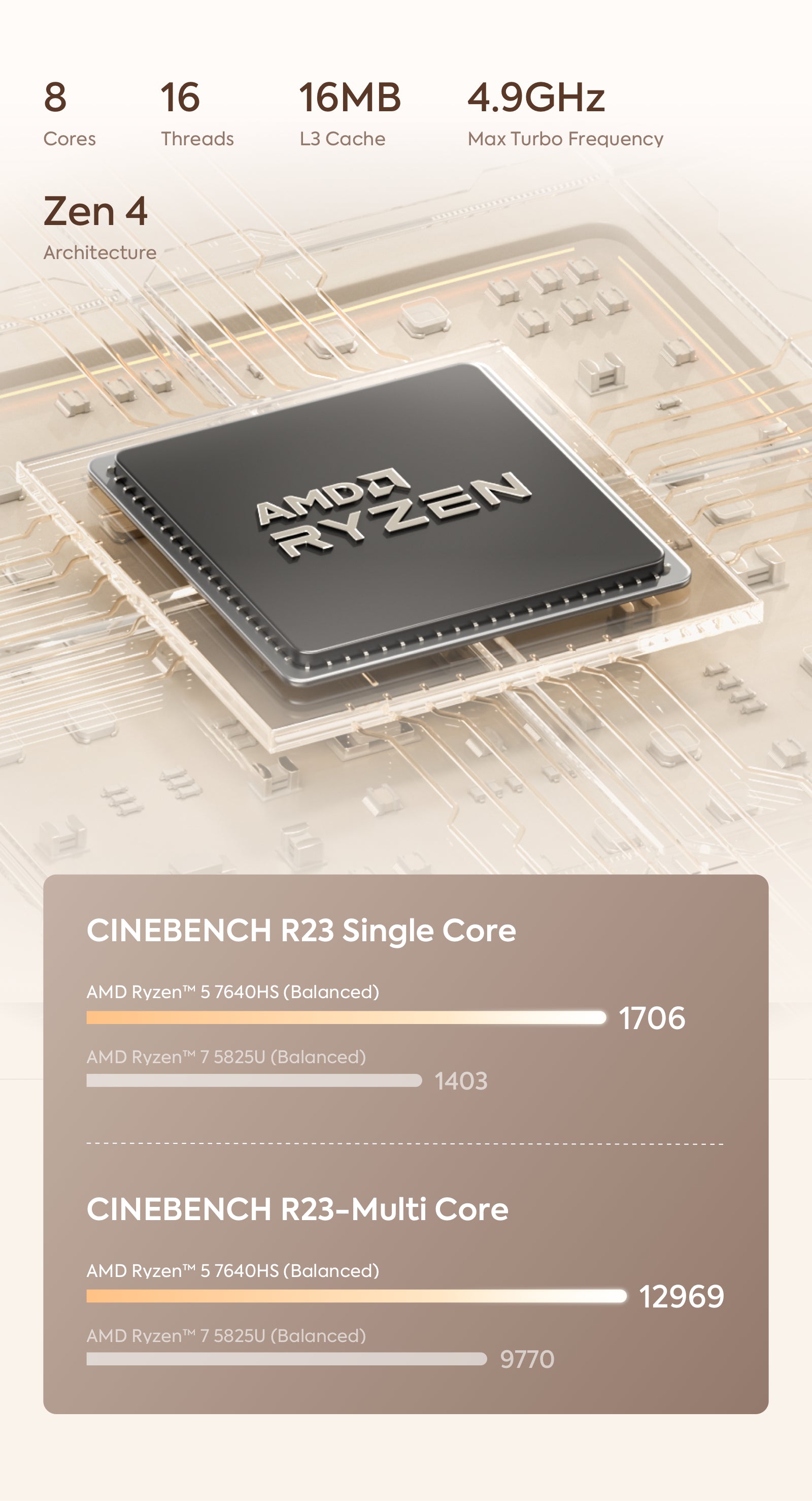It can reach up to 65W TDP, and thanks to the Zen 4 architecture, it boosts IPC for more efficient multitasking and better overall system performance.