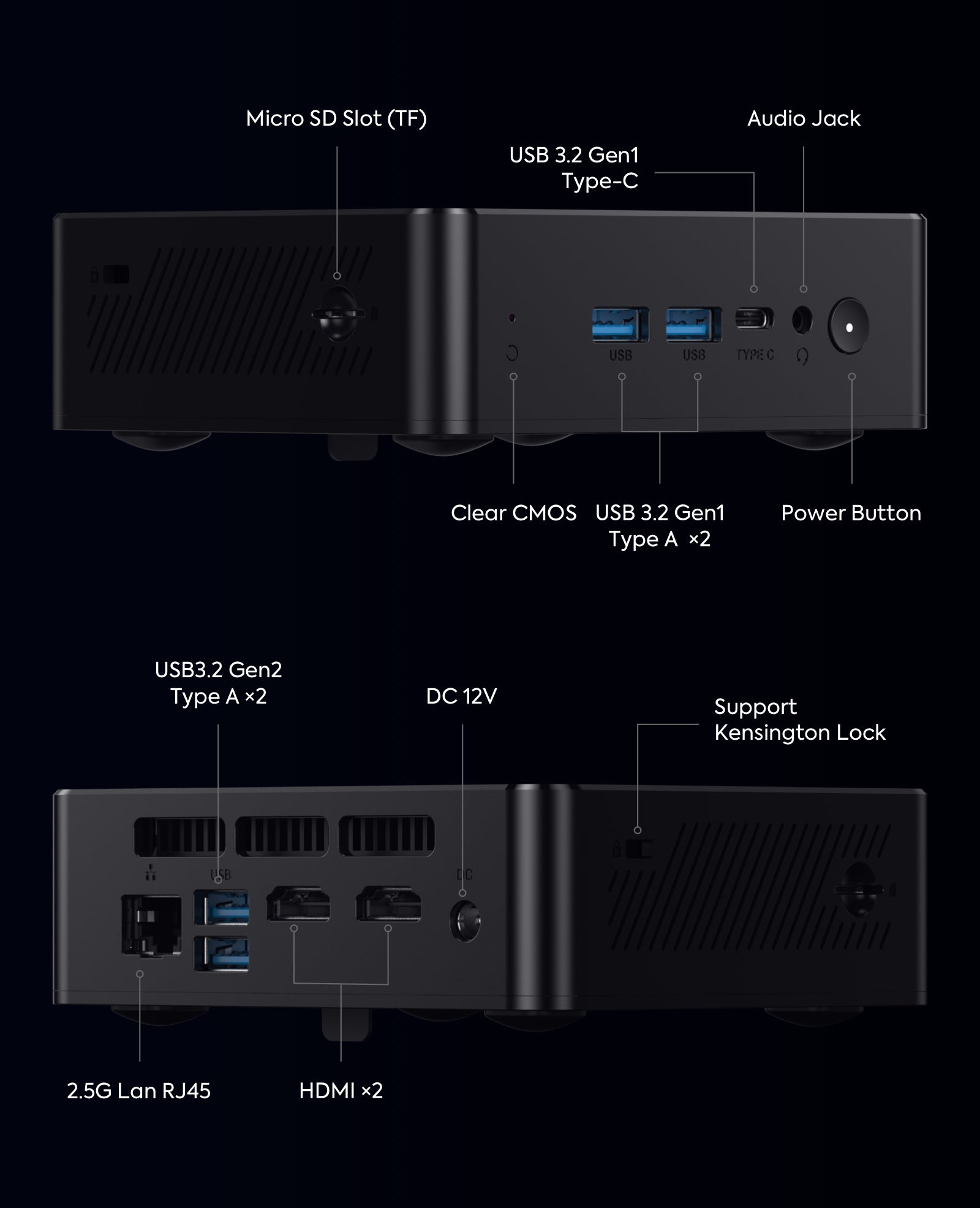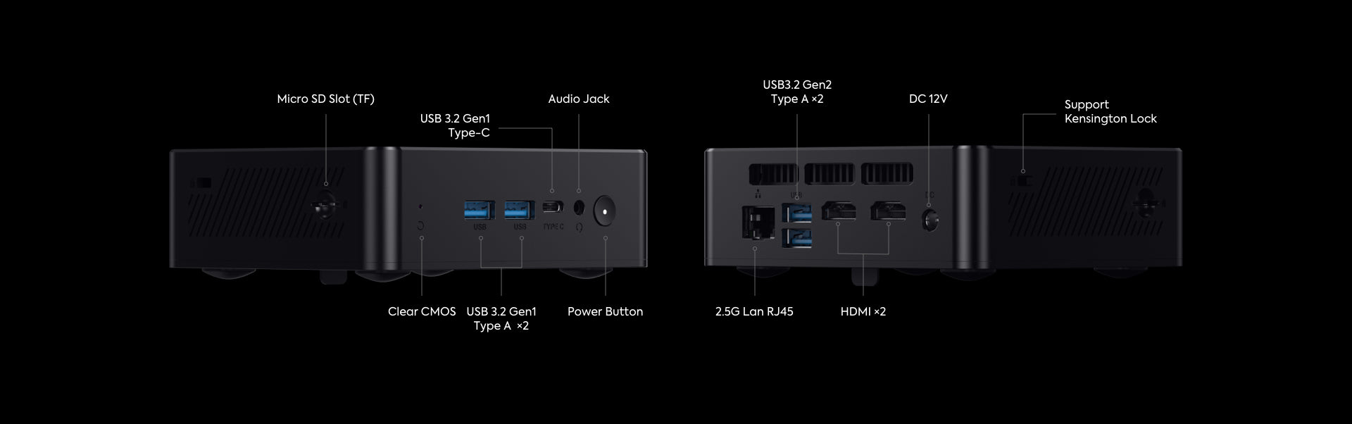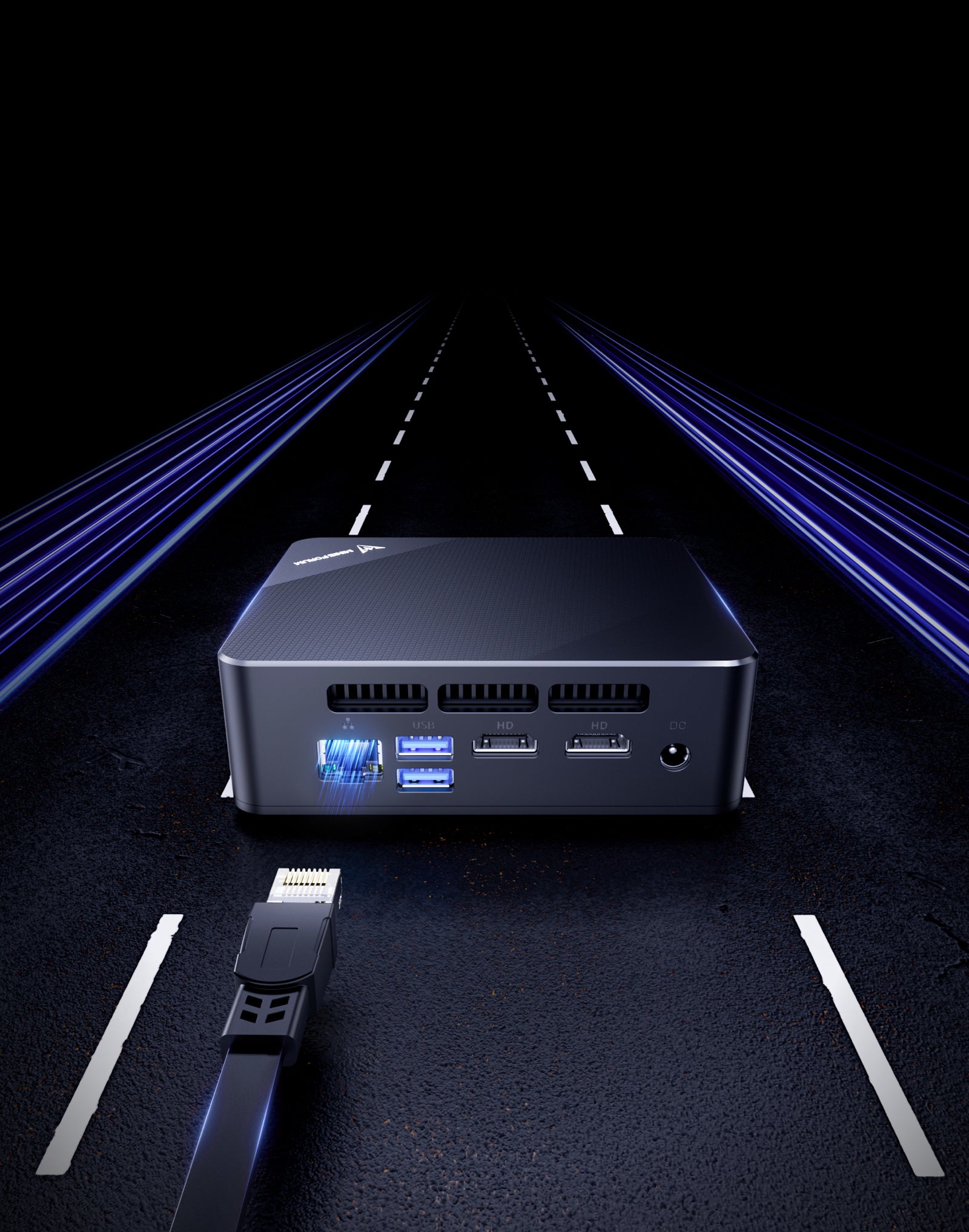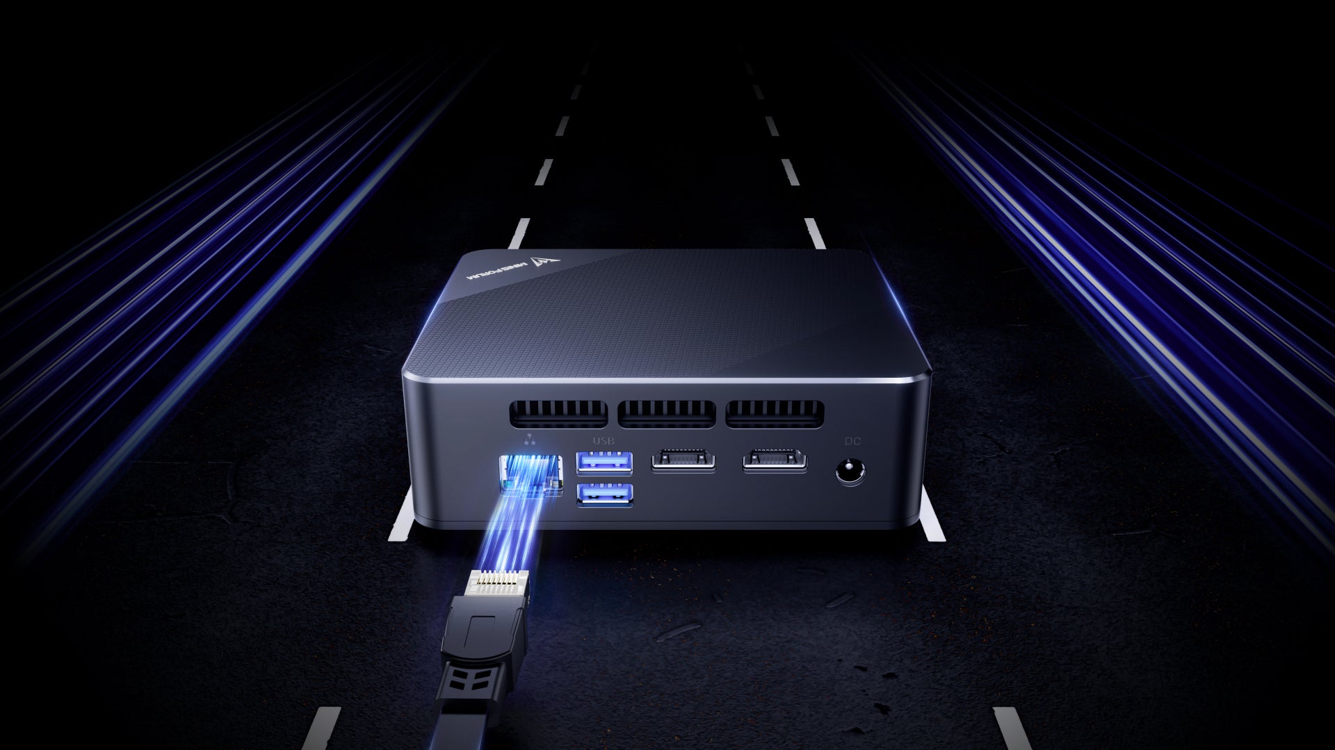 The UN100P's RJ45 port supports a transmission rate of 2.5Gbps, delivering faster data transfer speeds than traditional 1Gbps Ethernet ports, making it ideal for high-bandwidth applications. It also features WiFi 6 and Bluetooth 5.2, with WiFi 6 offering a theoretical maximum speed of 9.6 Gbit/s, ensuring excellent wireless performance and connectivity for various devices.