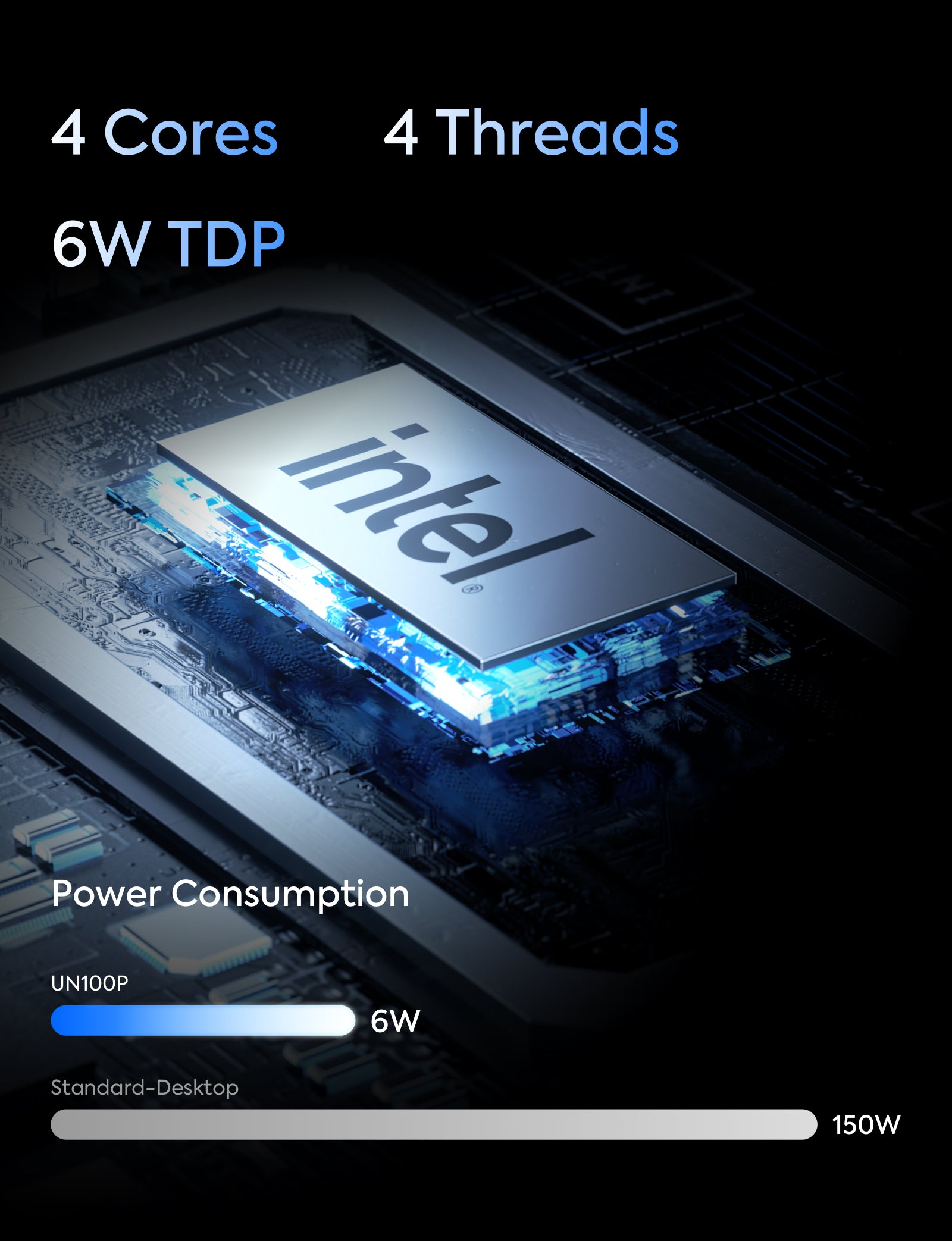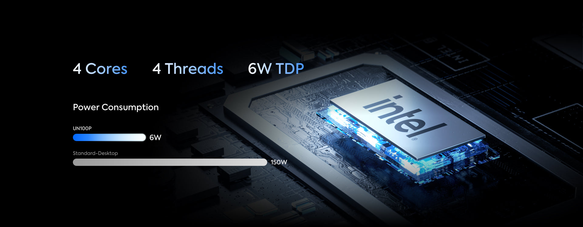 The UN100P features Intel's 12th generation ultra-low power processor, the Alder Lake-N100, which boasts a baseline TDP of just 6W, making it significantly more energy-efficient than other processors. Additionally, its RWD power release can reach up to 9W, showcasing a 23% improvement over the previous generation N5105. Overall, its performance comes remarkably close to that of the 11th generation Core i3-1115G4.